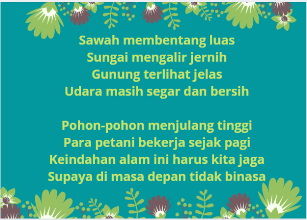 5 Contoh Puisi tentang Keindahan Alam. Indahnya alam ini Laut yang berombak Udara yang menyegarkan. 50 Contoh Poster dan Slogan Dengan Ide Menarik Poster adalah sebuah media yang berisikan tulisan atau gambar tapi juga bisa berupa keduanya.